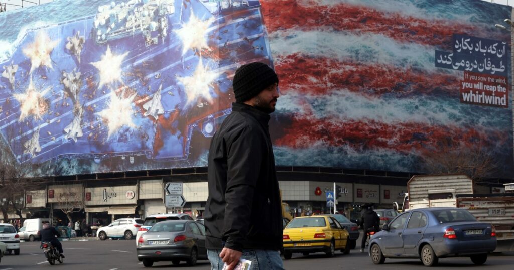 La gigantografía mezcla la imagen de una bandera estadounidense con un portaaviones bajo ataque.”Si siembras viento, cosecharás tempestad”, reza el fuerte mensaje del régimen. Read More